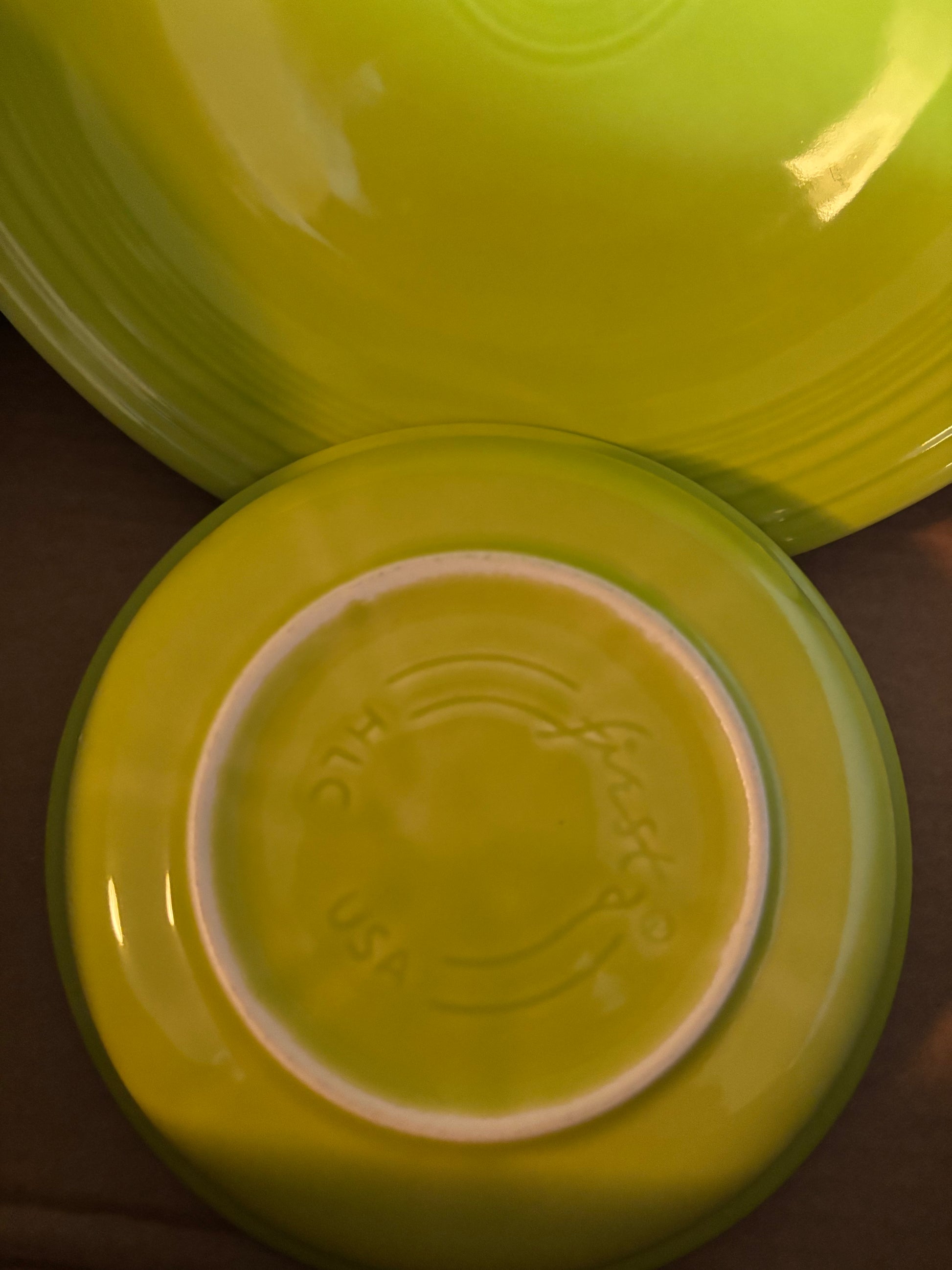 The Lemongrass color was discontinued, making complete sets harder to find. Fiesta dinnerware is fully vitrified, lead-free, and made in the USA.